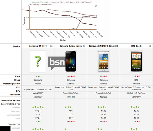 ▲ 在 Basemark ES 2.0 Taiji 測試的排行榜中可以看到 i9300 蹤跡(來源:BSN)
