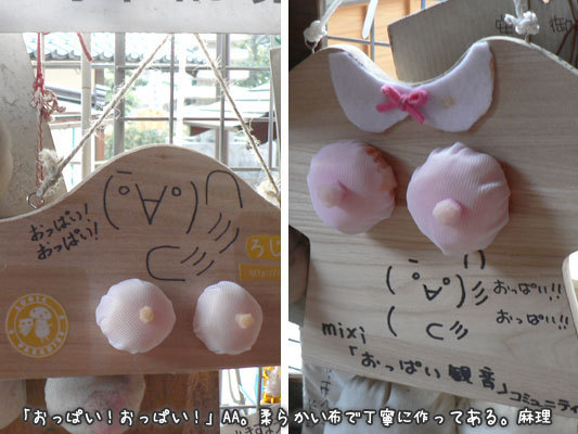 日本的美乳寺院,拜了會UPUP! 生活 · 小ㄤ · 發表於 2012-04-25 15:30 · · 檢舉 列印版 twitter plurk 9.0千閱讀次數 日本的神社是出了名的多,其中也有許多是以祈求姻緣而聞名,不過你知道日本還有專門祈求美胸的寺院嘛? 位於愛知県小牧市的間々(まま)観音位於,原本是求賜子、安產、授乳的寺院,不過近年來越來越多女性來寺院祈求美乳,而寺院也順勢推出許多胸部的紀念品,包括胸部繪馬、胸部鑰匙圈等。 ▲間々(まま)是日本為一的美乳寺院。 ▲寺院內也有許多的胸部象徵物。 ▲還有許多胸部的繪馬跟胸部的紀念品。 資料來源 5 個人說讚 收藏 快速回應 引言回應 登入來回應 header home