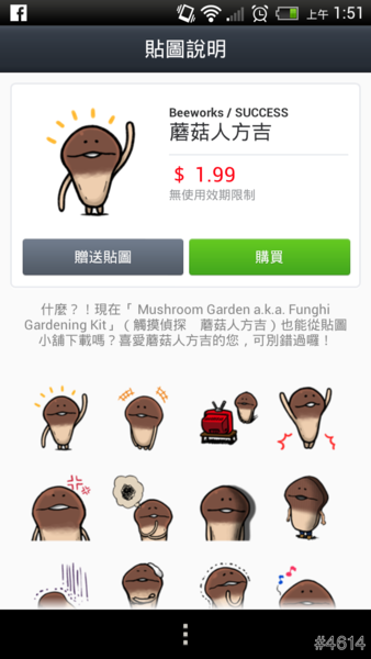 ▲ 在這邊我們送一個蘑菇人方吉給朋友吧!點蘑菇人方吉後可以看到下方有所有的圖案列表,上面可以選擇自己買給自己或是送給別人。