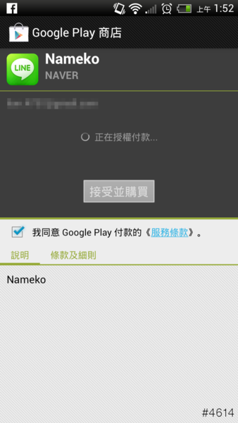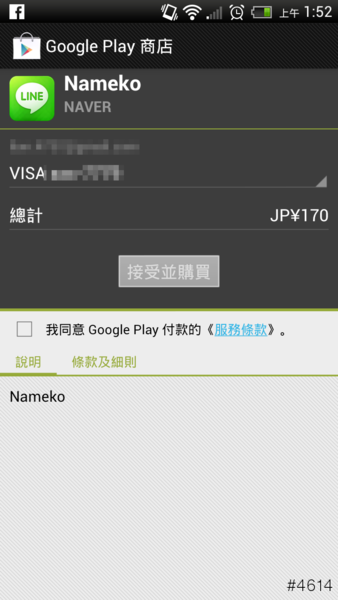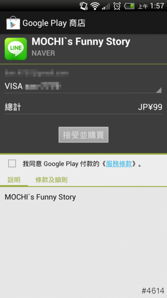 ▲ 確定購買後會跳到 GooglePlay 的確認畫面,如果你已經有登記過信用卡的話,就會讓你直接在這邊確認付款,如果沒有的話會要你登記信用卡。台灣各銀行的 VISA 金融卡也可以使用,但郵局的不行喔。