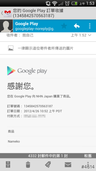 ▲ 而 GooglePlay 也會寄上一張收據到你的 E-MAIL 中。