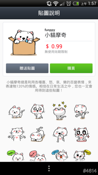 不知道是什麼關係,雖然 GooglePlay 仍然無法直接付費,但是在程式中的 in-app 購買是都沒有問題的,不會被擋住,於是像 Line 的貼圖購買與贈送就算在台灣也ok的,沒有問題,趕快去敲你的朋友,要他買一套小貓送給你吧~