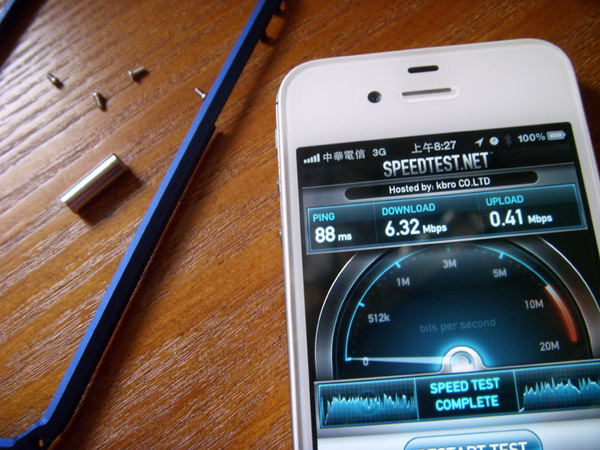 講了那麼多優點,有沒有缺點呢?有的… 經過實際使用發現,Mindplar i+CASE難逃所有鋁框的宿命--->「影響信號」,影響的程度有多少呢?個人測試大概有10%~20%左右,這是一個要求有圖有真相的時代,所以我特別在同一個時間點,將有裝鋁框跟沒裝鋁框的信號及速度做了一個測試,這是在我信號滿格的房間所測得,下載速度可達 6.32Mbps