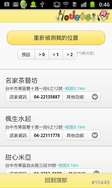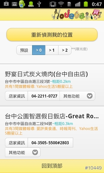 直接查詢現在所在位置,附近店家列表清單就能依照距離遠近排序,還能選擇媒體曝光度,>0為一家媒體報導過,>1為兩家媒體報導過,依此類推,能快速找到附近的人氣店家!