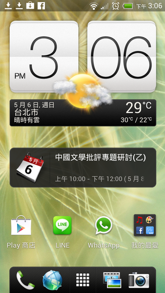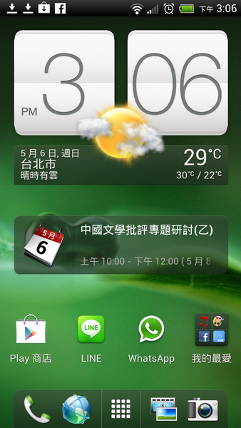 ▲ 更換面板後可以看到,不只配色,就連桌布、小工具等等都完全不一樣了。雖然官方給的十分美觀與精緻,但我還是希望 htc 能放出官方的面板編輯器,讓大家來集思廣益呢,看看以前 SE 的主題編輯多麼生氣蓬勃阿!