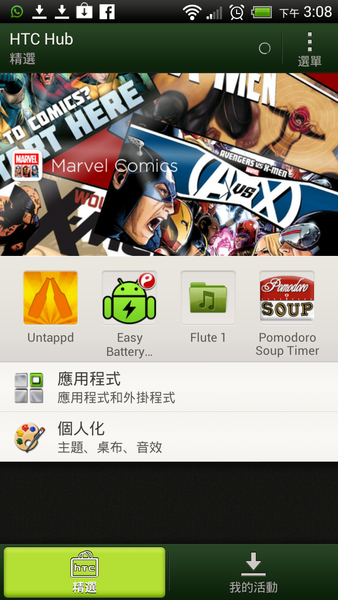 ▲ 更詳盡的方法是點擊「HTC HUB」這個程式,這個程式是 hTC 自己的小工具、軟體、面板、鈴聲、桌布等等的市集,全部都是免費的。我們在這邊點「個人化」。