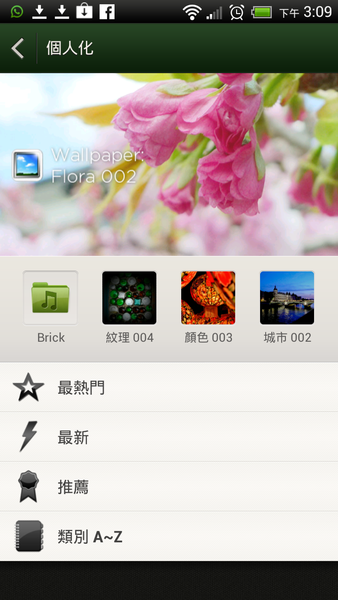 ▲ 之後可以進到 HTC HUB 的個人化介面,可以在上頭看到推薦的東西以及其他選項、排行榜等等。在這裡我們點「類別 A~Z」,就會進入右圖的所有類別。喂 HTC,你這邊沒有翻譯到阿(揮旗子)