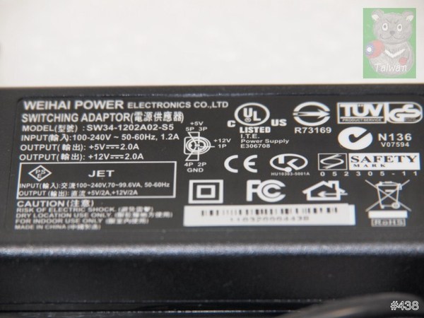 電源供應式採用外接的變壓器、是台灣威海電子的產品(Made in China),100~240V / 50~60Hz, 1.2A,採用 5 Pin加防呆接頭設計、而且標示清楚,這樣的電力區間出國攜帶都不用擔心與煩惱。