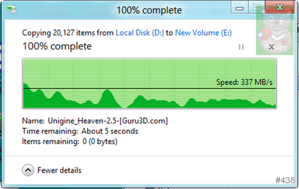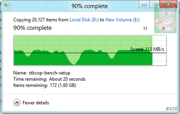 Windows 8 的Copy程式執行過程測試、測試資料匣同前就是相同Test Packs的資料夾、總容量是19.5GB共16,696檔案,大小都有。由SSD的D碟COPY TO GR3630-SB3的E碟。