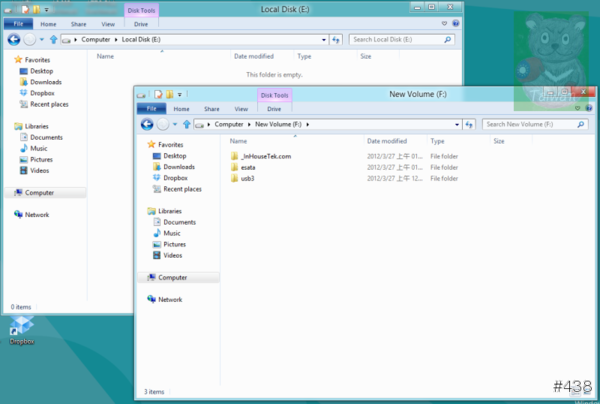 如果基於安全優先的考量下GR3630-SB3應該優先採用Raid 1架構來用,但是因為這是外接式的USB 3.0介面的測試、應該有人會對有速度考量的Raid 0架構更有興趣,所以這裡的測試是採用RAIDON GR3630 + Hitachi 2TB HD x2 組成Raid 0架構的外接儲存硬碟形式然後再Windows 8進行測試。