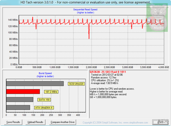 測試環境與GT1650-SB3完全相同、GR3630-SB3 + Hitachi 2TB HD x2 組成 Raid-0