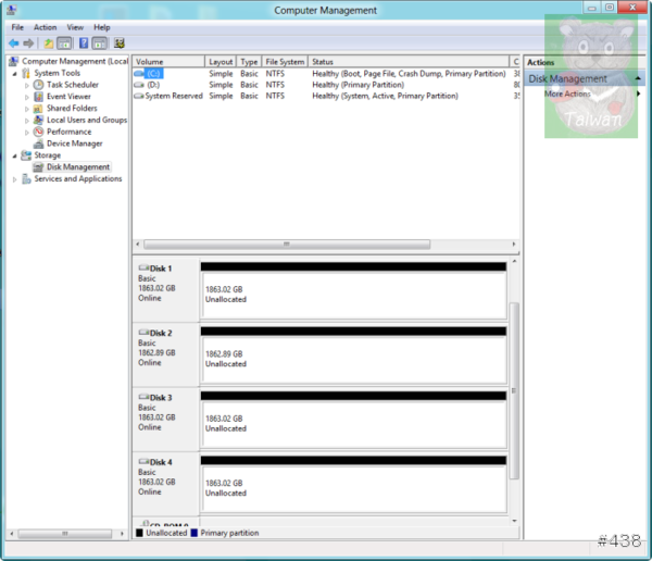 進入Windows 8的磁碟裝置管理...怪了~,看到2個2T的UnKnown磁碟、一個4T的E:磁碟、還有一個可用的F:磁碟機,明明就是2Tx4...這下怎麼多了2TB出來,難道GT5630-SB3有特異功能?