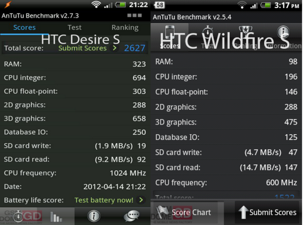 ▲ GSM Dome網站也為 DesireC 進行了效能分數測試,分數結果大概是落在野火S與 DesireS 的中間。