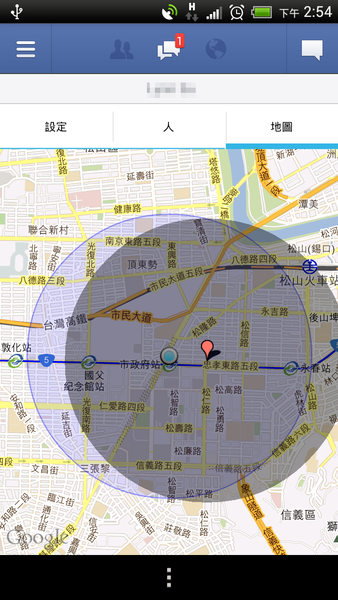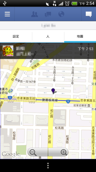 ▲ 這個功能就比較厲害了----或是恐怖,這邊可以看到如果使用手機聊天的人,在傳出訊息時的所在地,藍色的點是使用者目前的位置,紅色的標籤是發訊息人的座標。可以點標籤來看到當時他在那邊傳了什麼。這個功能可以在你用手機傳訊息時經由點擊訊息欄位的藍色導航箭頭來開關。