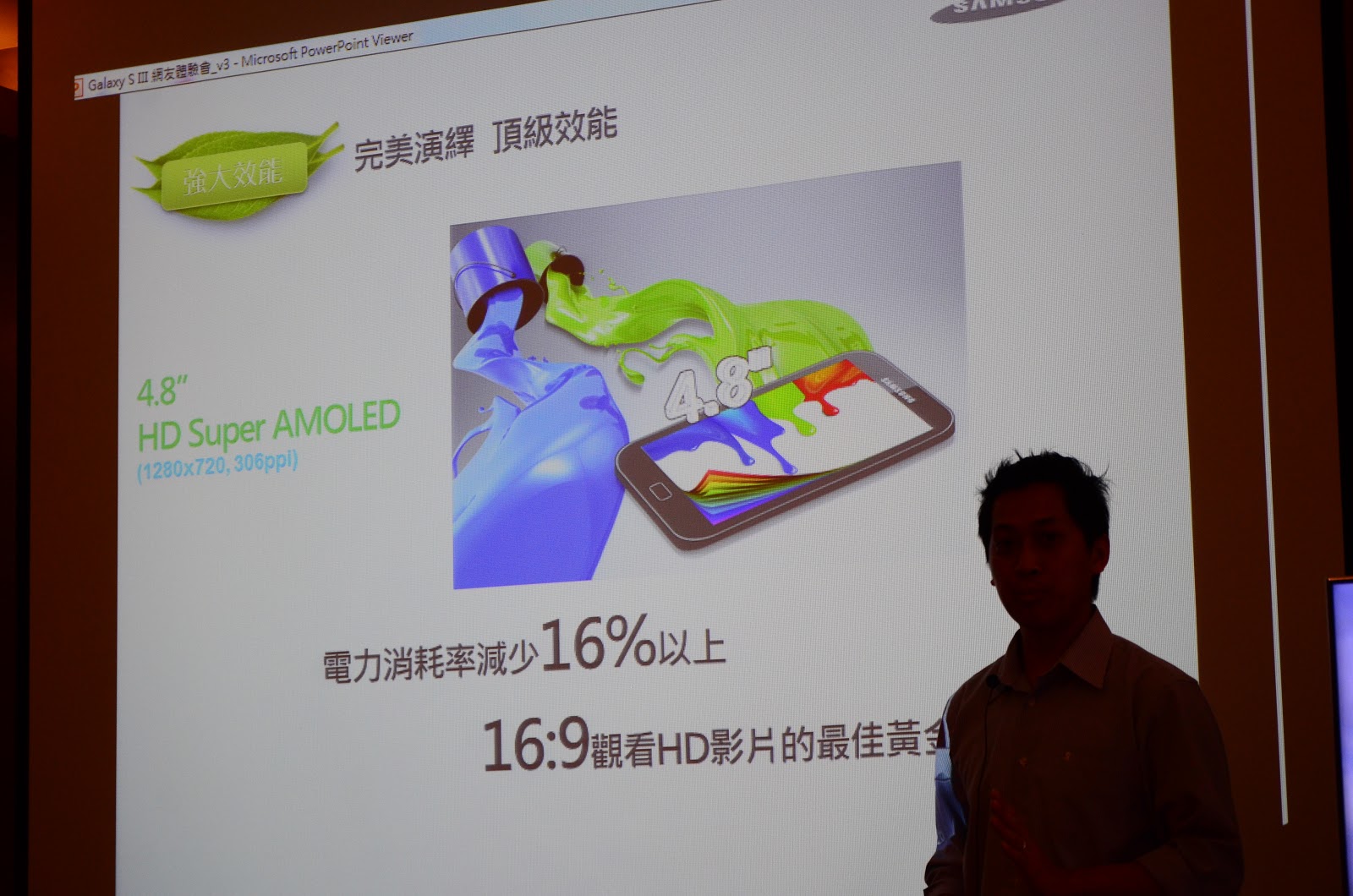 ◎S3採用 4.8吋 HD Super AMOLED,AMOLED的發光原理是需要顯示的畫素才通電,與LCD比起來相對省電,電池續航力因此受惠。另外大螢幕加上16:9的螢幕比例,拿來看影片相當過癮!