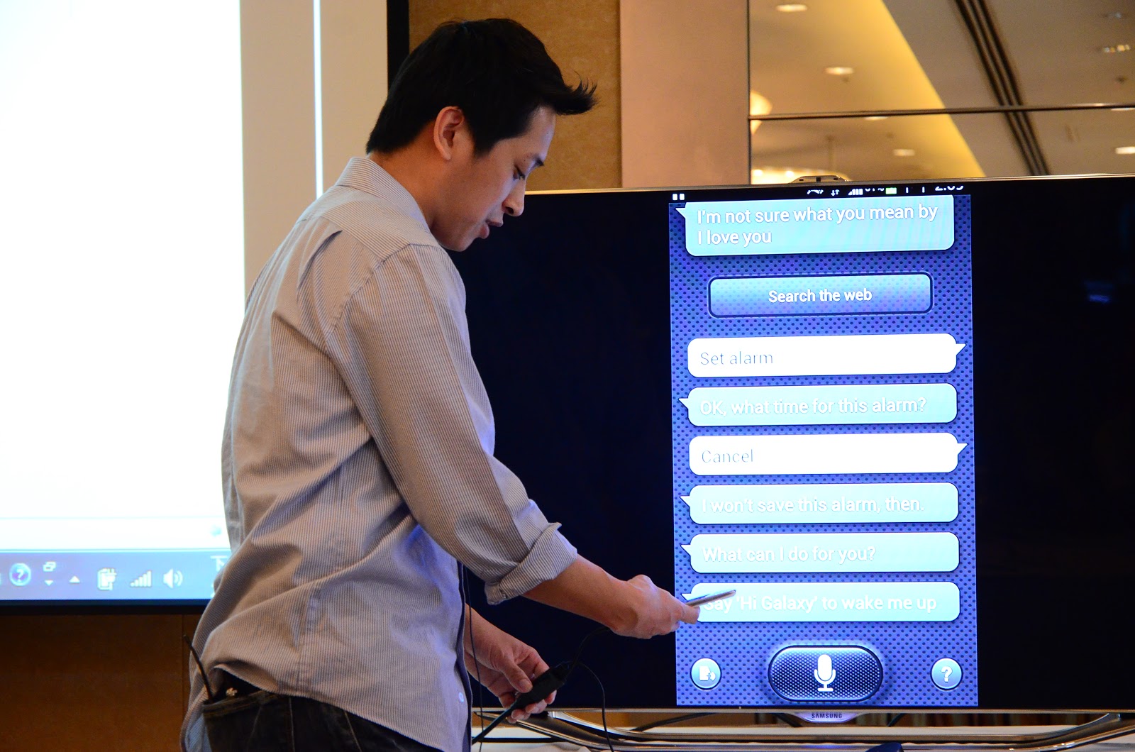 圖為三星PM ERIC示範S-Voice,但也因環境吵雜而失敗。