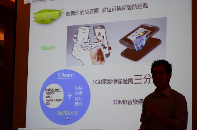 ◎S-Beam =Galaxy Nexus 加入的Android Beam(NFC為基礎) +Wi-Fi Direct 。S-Beam 是以Android Beam 為基礎發展的傳輸方式,把Android Beam的可用範圍與實用性大大提升,傳輸1GB的檔案僅需3分鐘。使用方式非常簡單,只要開啟功能後將兩支手機背對開啟傳輸後,即可拿開繼續傳輸。缺點則是目前只有S3加入此功能支援,無法與其他手機配對使用。