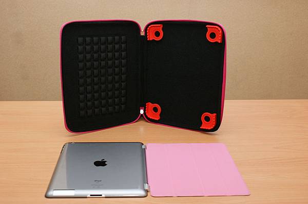 桃紅款正面攤開的樣子如下圖,一側有許多柔軟的小泡綿可以保護 iPad 螢幕,另一側則有4個可固定iPad機身的側邊橡膠Bumper。