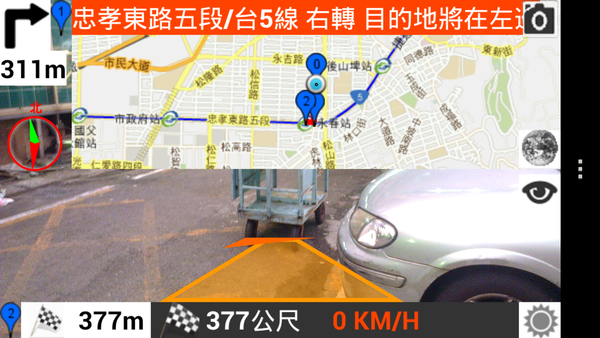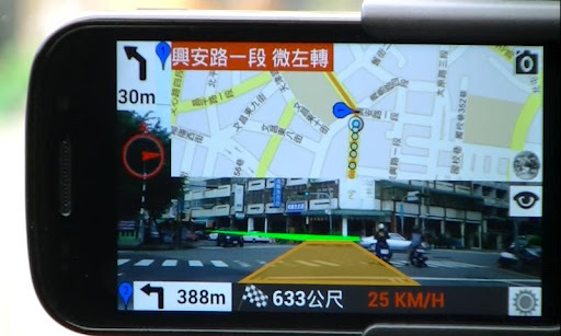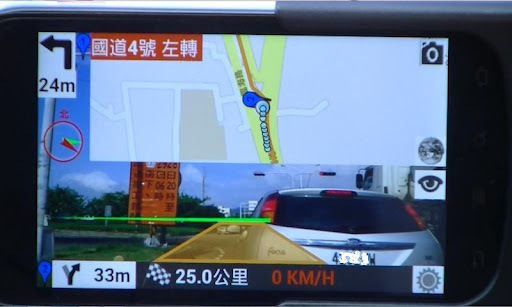 目前市面上的導航軟體都是直接將圖示秀在導航機子上,各大車廠也還沒有研發出可以正式實用、類似閃電霹靂車那樣直接在汽車擋風玻璃上顯示出各種資訊的功能。但山不轉路轉,我們的智慧型手機上頭不正有一個相機嗎?