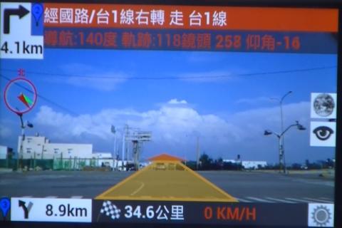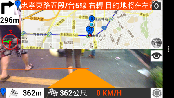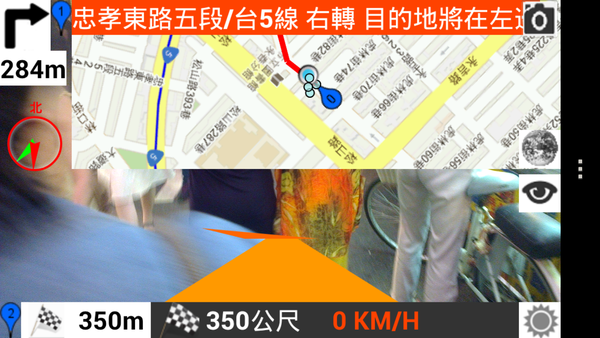 ▲ 導航地圖可以切換顯示,可以選擇你是否要雙畫面同時顯示,或是僅顯示實景畫面、導航畫面。其他諸如時速顯示、距離、轉彎提示也都有作出來。