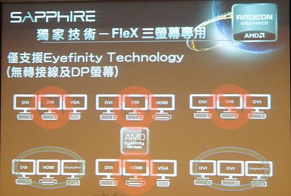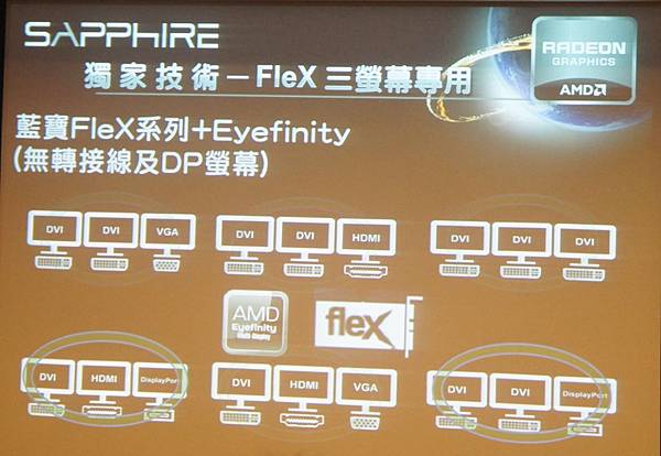 【▼】藍寶獨家的技術FleX三螢幕專用~讓多螢幕顯示效能發輝到極致!首創免DP訊號啟動三螢幕,Eyefinity的實用性延伸,將3螢幕顯示輕鬆的成為玩家的基本配備。 藍寶的FleX系列提供最經濟的Eyefinity方案,最輕鬆的三螢幕觀看,任選三個輸出介面輕鬆實現三螢幕無限視界。