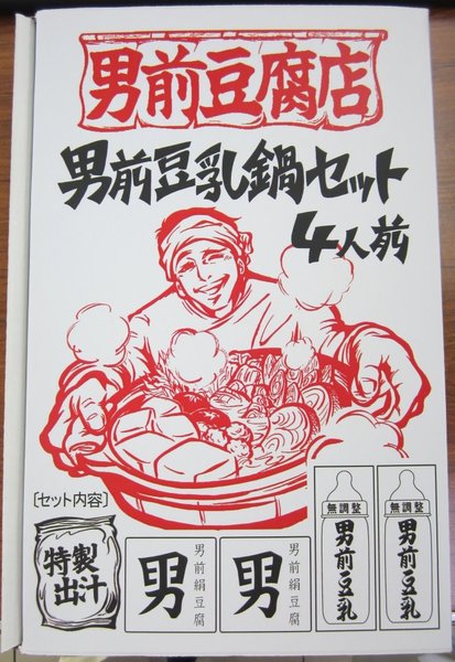 男前豆腐店的社長伊藤信吾原本是為上班族,後來回家接手父親慘淡的三合豆友食品公司,負責開發工作,為了打破傳統賣豆腐的刻板印象,伊藤信吾特別跟來自華裔及歐美的人合作推出了新的「男前豆腐」品牌,將原本四四方方的豆腐造型改變成為水滴狀的造型,並搭配上擁有暴走族風格充滿男子漢的包裝,在市場上掀起一陣旋風。
