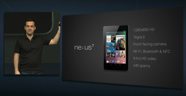 ▲ Nexus7 的規格就跟之前謠言所傳的差不多,四核心 Tegra3 1.3 GHz 處理器,1GB ram,7吋 的 IPS 面板螢幕,解析度為 1280 x 800,只有前鏡頭而沒有後置鏡頭,可以連續播放影片達九個小時,支援藍牙、Wifi、近場通訊(nfc),重量僅 340 克。