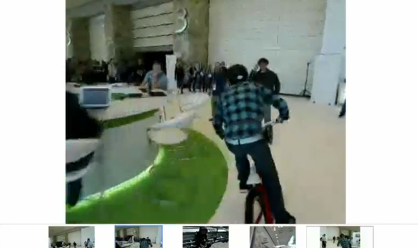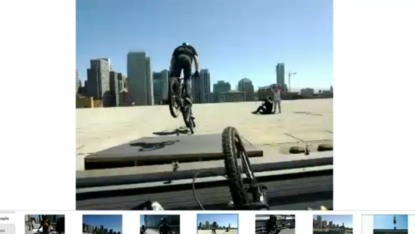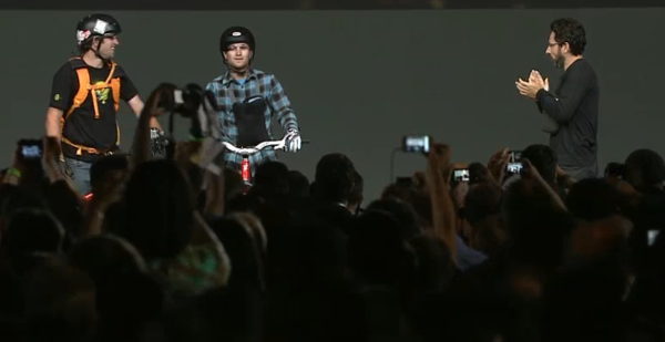 ▲ 降落到地面只是個開始,馬上又換上腳踏車往會場前進,途中還帥氣的翻了一圈,這一切一樣經由 Google Glasses 與 Google+ 的 Hangout 視訊聚會直播在大螢幕上。