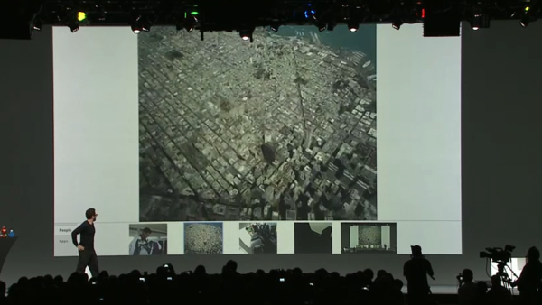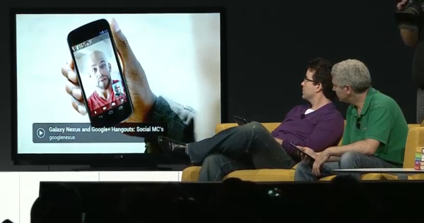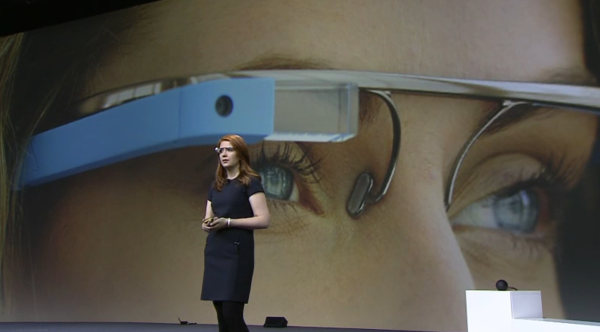 ▲ 在之前已經有在媒體曝光過的 Google 眼鏡現在正式的向大家介紹,主持人正帥氣的走出來,突然:「喔喔?我們有來自空中的通訊…」。
