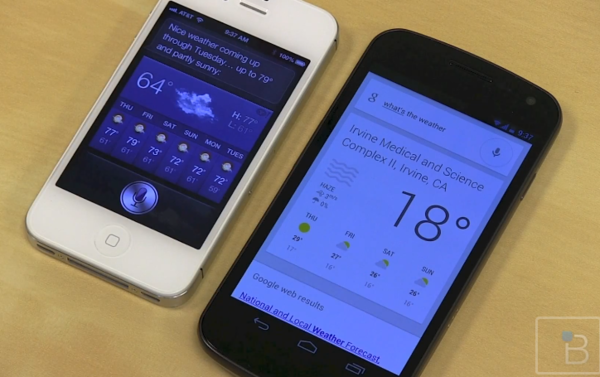 ▲ Siri 的輸入方式是按住 Home 鍵來叫出 Siri 介面,而 Google Now 則是從搜尋欄的麥克風來啟動。