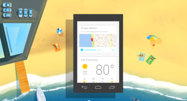 ▲ 例如你在舊金山的海灘曬太陽,GoogleNow 就會直接秀出當地的天氣、溫度、地圖等等的資訊,而不需要你再額外下其他指令。
