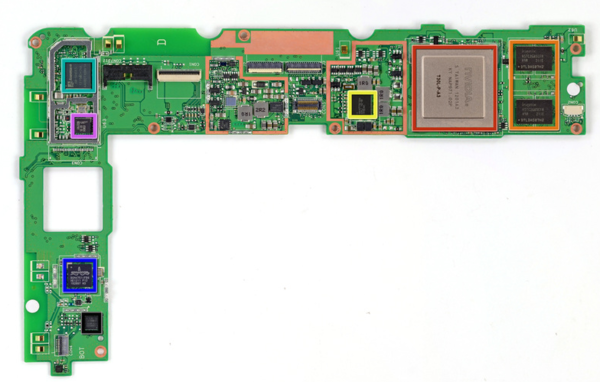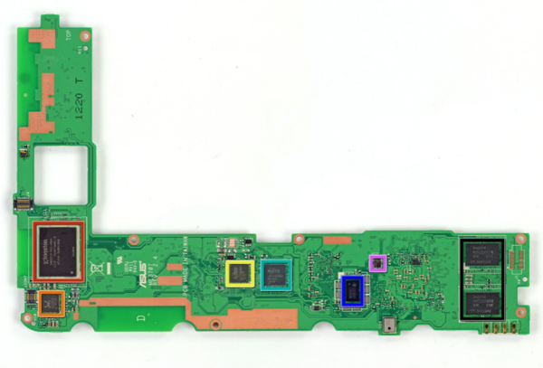 ▲ 橘色圈是 Hynix DDR3 1GB Ram,紅圈是 Nvidia Tegra3 晶片,黃圈是 Max 77612A inverting switching regulator 開關穩壓器,青圈是 AzureWave AW-NH665 wireless module 無線模組,籃圈是 Broadcom BCM4751 integrated monolithic GPS receiver GPS 接收器、粉紅圈是 NXP 65N04,黑圈是 Invensense MPU-6050 gyro and accelerometer 陀螺儀與偵測儀。