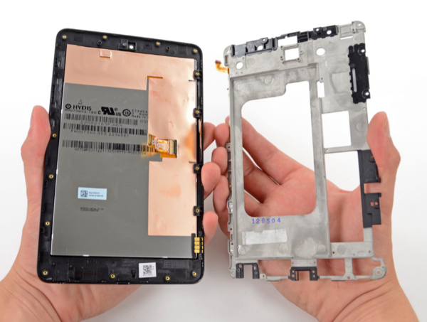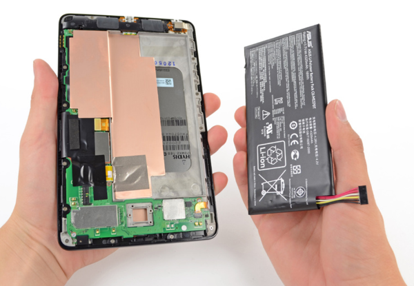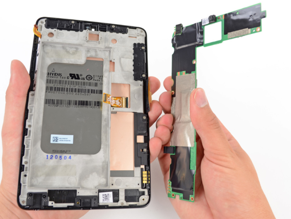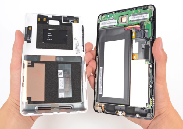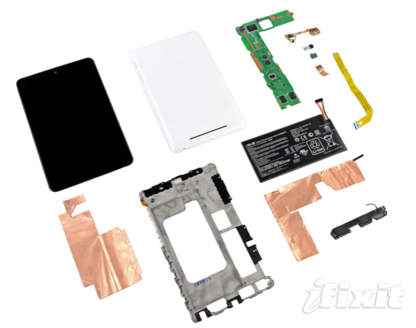 ▲ 整體拆下來,iFixit 認為 Nexus7 是相當容易拆卸的一款機子,它沒有特規的螺絲、外殼只需要直接撬開,電池十分容易拆卸,主機板與其他元件也都可以拆卸而不需要破壞。但 iFixit 也提出一個缺點,也就是螢幕跟面板是黏在一起的,這可能會在日後增加維修費用,如果面板或是玻璃其中一個損壞,你還是得更換一整組而不能個別維修、替換。
