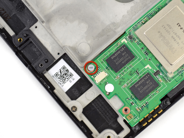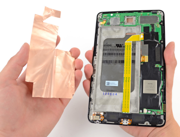 ▲ 拿下電池可以看到下面還有一片金屬片,iFixit 猜測那可能是散熱用的,但更有可能是 EMI shield 訊號遮罩,而在使用過程中 Nexus7 溫度並不會非常的高。
