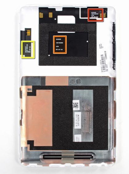 ▲ 背蓋上紅色的是 GPS、橘色是 NFC、黃色是 Wifi,下面包的黑色與白色似乎沒有特別的功能,或是還不確定那能夠作什麼。