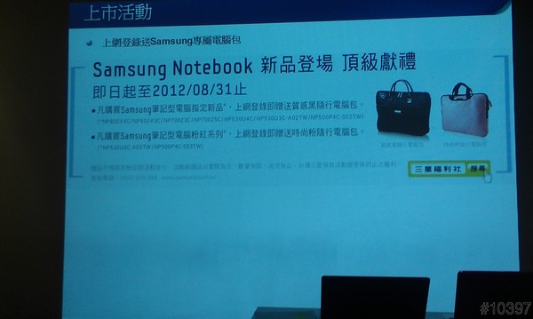 搭配新一代 Samsung 筆記型電腦上市,三星特別推出頂級獻禮,即日起至 2012/08/31 止,凡購買 Samsung 筆記型電腦指定新品,前往「三星福利社」官網登錄即贈送「質感黑隨行電腦包」;或是購買 Samsung 筆記型電腦粉紅系列,前往「三星福利社」官網登錄也可獲贈「時尚粉隨行電腦包」。贈品數量有限,送完為止,敬請把握。「三星福利社」網址:https://member.samsung.com.tw/vip/index.aspx