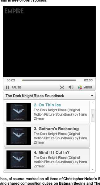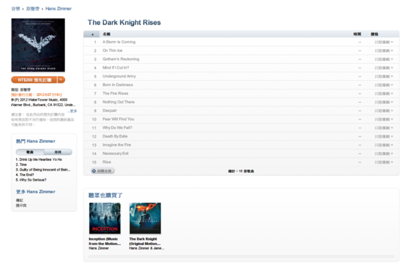 作為三部曲的終結,配樂自然也帶有第一集與第二集相同的配樂元素,但當然不是完全沿用,從第三首〈Gotham's reckoning〉就可以發現跟預告片的監獄橋段有呼應之處(看這邊),其他更多的東西當然得等到 7/20 號電影上映才能夠瞭解。Empire 表示試聽將會到 7/20 號結束,屆時電影與原聲帶都會上映與上市,你在 iTUNES 也可以購買得到。
