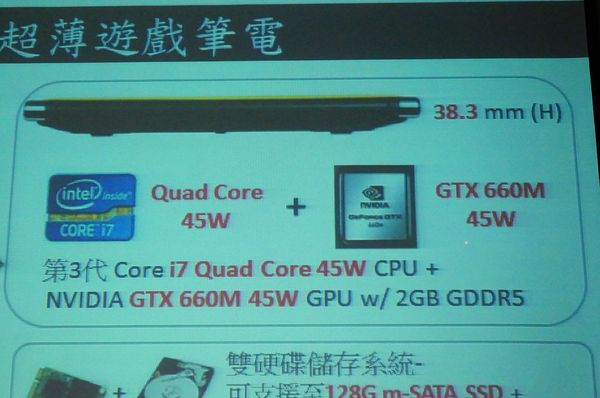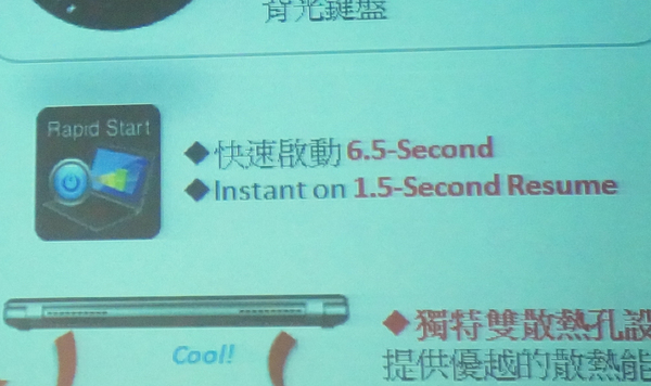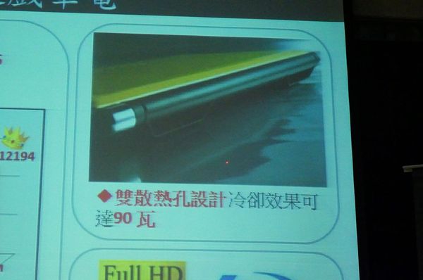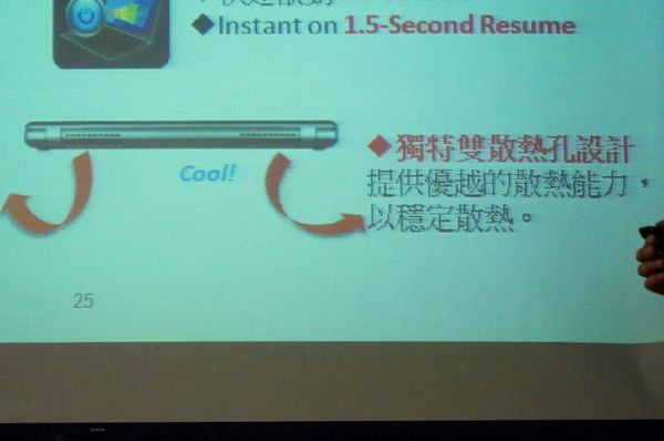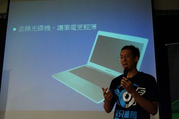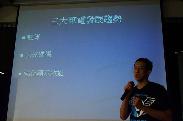▲首先,文恩先介紹目前筆電是朝著那些方向發展,從投影片中可以看到現今筆電朝著分別是輕薄(這樣帶出門才比較方便)、去光碟機(目前光碟的使用漸漸被隨身碟或是隨身硬碟給取代了)以及強化顯示效能(隨著螢幕解析度越來越高,用筆電撥放高畫質影片或是打D3、星海也不是甚麼稀奇的事,也因此顯示效能的重要性越來越高)這三大面向去發展。
