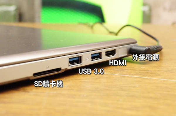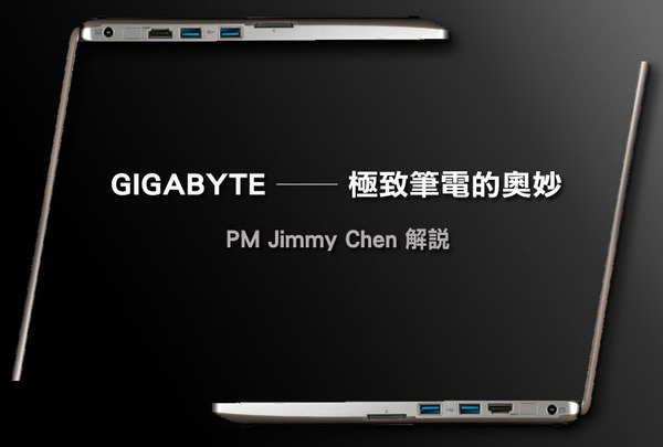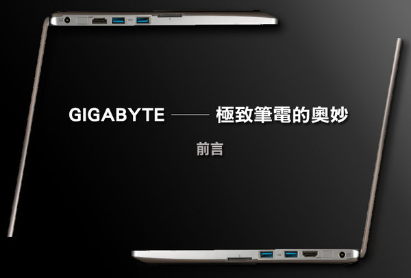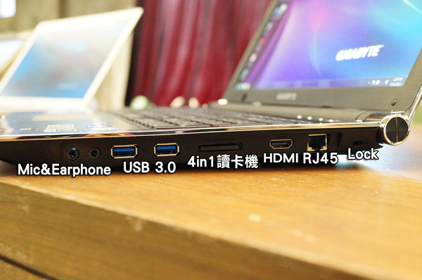 ▲U2442 機身的右側,由左至右分別是 SD 讀卡機、兩組 USB 3.0 接孔、標準 HDMI 接孔和外接電源孔,各位可以從USB PORT 的比例看出 U2442 放入了標準電壓CPU、獨顯、雙硬碟的機身真的是超薄的! 在這裡也透露出技嘉的工業設計能力相當精湛。