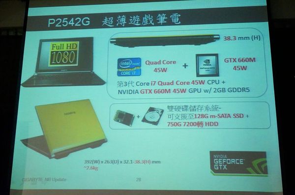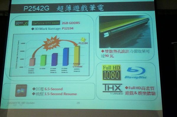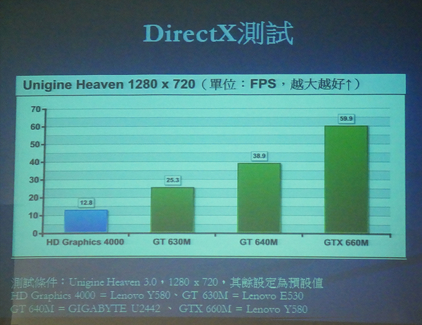 ▲從這張投影片中可以看到文恩為我們做的測試,GIGABYTE Ultrabook U2442 搭載的是GT640M,而另一款超薄遊戲筆電 P2542G 則是搭載最高階的 GTX660M獨顯,比起藍色長條的內顯效能至少有3~5倍的差距,可以很明顯看出獨顯在多媒體處理上的優勢。