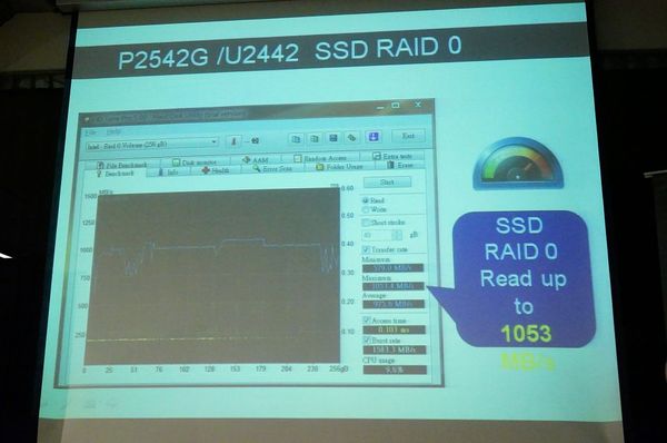 ▲U2442 和 P2542G 插上雙SSD硬碟做 RAID0,資料讀取速度高到每秒 1053MB,比起一般硬碟每秒60~70MB的速度實在是天差地遠。
