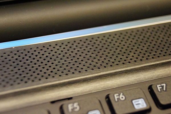 ▲圖中可以看到 U2442 的雙喇叭設計在鍵盤區的上方,聲音藉由螢幕面板的反射可以讓使用者聽得更清楚,喇叭左右兩側的面板也配合做了圓點花紋看起來十分典雅。