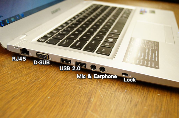 ▲U2442 的機身左側插孔,由左到右分別是 RJ45網路孔、D-SUB 接孔、兩組 USB 2.0接孔、3.5mm 麥克風接孔和耳機接孔,最右邊的則是筆電鎖。內部的配色除了鍵盤按鍵也是銀灰色的設計,和鍵盤按鍵的黑色對比很明顯,因此輸入時辨識度因此大大提升。