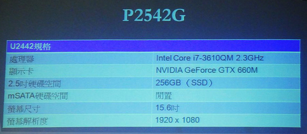 ▲接下來這款 P2542G 想必是今天的老大哥了,15.6吋的螢幕塞下Full HD 1080P的解析度拿來看電影打D3爽度都滿分,P2542G 的處理器是第三代I7 Ivy bridge Core I7-3610QM 2.3Ghz 四核心處理器另搭配 NVidia Kepler架構的 GTX 660M 獨立顯卡,完全是為了遊戲影音多媒體而生的超兇悍筆電。