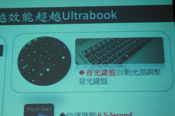▲U2442 的巧克力鍵盤看起來好好吃啊,因為今天的測試機不是正式上市用的,因此沒有刷上注音符號或是倉頡,對於已經很熟悉筆電鍵盤配置的人來說感覺又更加簡約了。各位也可以注意鍵盤底下有閃爍著微微的燈光,U2442 的鍵盤有背光功能,可以讓使用者自行設定要開啟或是關閉,所以即使是在昏暗的禮堂也不用擔心找不到按鍵(≧▽≦)
