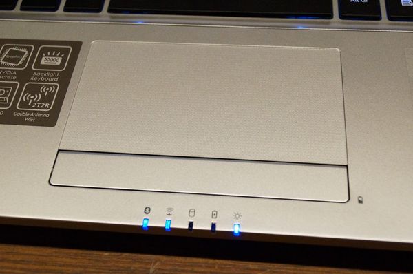 ▲U2442在觸控板前端有五個分別是不同狀態的指示燈,然而關機時這些不同狀態的指示燈便會合作成為電量顯示燈,只要按下觸控板的右鍵就可以顯示約略電量得知筆電大概還剩多少電,以免帶出門卻發現已經沒電的窘境。