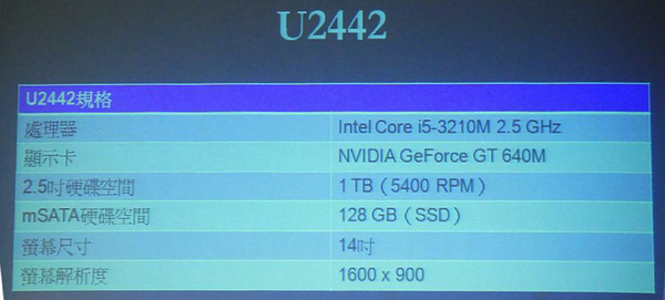 ▲先看到規格表上的 Core I5 3210M 2.5Ghz 雙核心處理器,這款處理器採用的是 35W 一般電壓,比起大部分 Ultrabook 的 17W 低電壓版本處理器會有更好的效能表現,另外就是本次活動的重點獨立顯卡了,U2442 使用的是 NVidia GeForce GT640M 顯示卡,顯卡內建 2GB 的 VRAM,我自己是覺得這對於高解析度或是多螢幕輸出時會有很大的幫助,值得一提的還有它的螢幕解析度不是普遍採用的 1366*768 ,反而是 HD+ 的 1600*900 LED 背光螢幕,這對於一般上網看圖、同時必須處理很多視窗、瀏覽高畫質電影甚至是撰寫程式碼來說都有很大的幫助。U2442 同時搭載了HDD和SSD,這對於平時喜歡下載許多影片又希望系統運行速度快速的人來說真是棒極了!