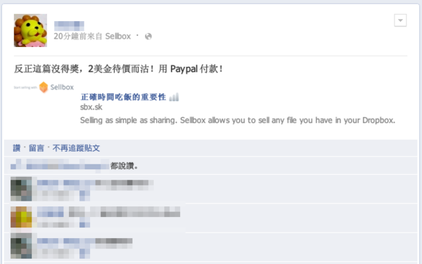 簡單試用過後,SellBox 用起來跟 Dropbox 果然十分的類似,非常的簡單、易於使用,但這在賣東西上面可能反而是個缺點,最大的缺點就是:缺乏預覽模式。是的,如果我沒有在標題上寫清楚的話,一般人根本不知道我在賣什麼東西,一切都只能從我的標題上去猜測(順帶一題,那是一篇小說),我的建議是 SellBox 未來起碼要對比較流行的格式做出預覽的功能,例如音樂的話可以讓人試聽30秒,照片的話可以看縮圖,文章的話可以節錄一段出來,我認為這樣才能更加完善這項服務,而不僅僅只是「上架」非常容易而已。