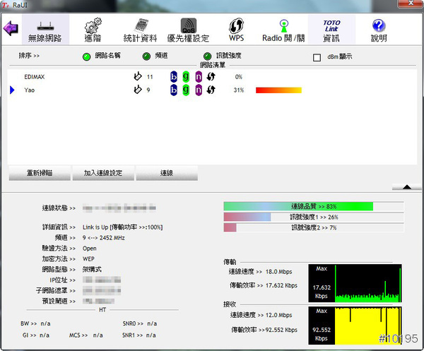 [分享] [得獎]TOTOLINK N500UD 無線網卡開箱 王團研究室 · Neil · 發表於 2012-07-21 00:59 · · 檢舉 列印版 twitter plurk 1.1萬閱讀次數 包裹 全新未拆封 然後我拆了── 使用指南x1, 驅動光碟x1, 網卡x1, 4dbi天線x2, USBx1 合體── 造型還蠻唯美的,微弱的訊號燈不礙眼 UI Speed Test (10M ADSL → Dlink WIRELESS 150 → TOTOLINK N500UD) 官網產品介紹 無線AP裝在1F,電腦在2F使用,收訊增強很多,不過月初才DIY RJ45牽線到2F =口=" 1 個人說讚 收藏 快速回應 引言回應 共 3 則回應 1 樓 · huiedda · 發表於 2012-07-21 17:43 · 檢舉 對不起,此篇回應已被標記為垃圾,內容只有管理員可見。 讚 2 樓 · rick · 發表於 2012-07-22 21:51 · 檢舉 對不起,此篇回應已被標記為垃圾,內容只有管理員可見。 讚 3 樓 · huiedda · 發表於 2012-07-23 21:39 · 檢舉 對不起,此篇回應已被標記為垃圾,內容只有管理員可見。 讚 登入來回應 header home