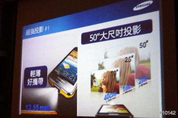 ▲Samsung Galaxy Beam的厚度只有12.55mm,跟以往投影機的概念完全不同,攜帶性非常高;而且可在2公尺內即可投影出50吋大螢幕,但記得要調整焦距才會清楚喔